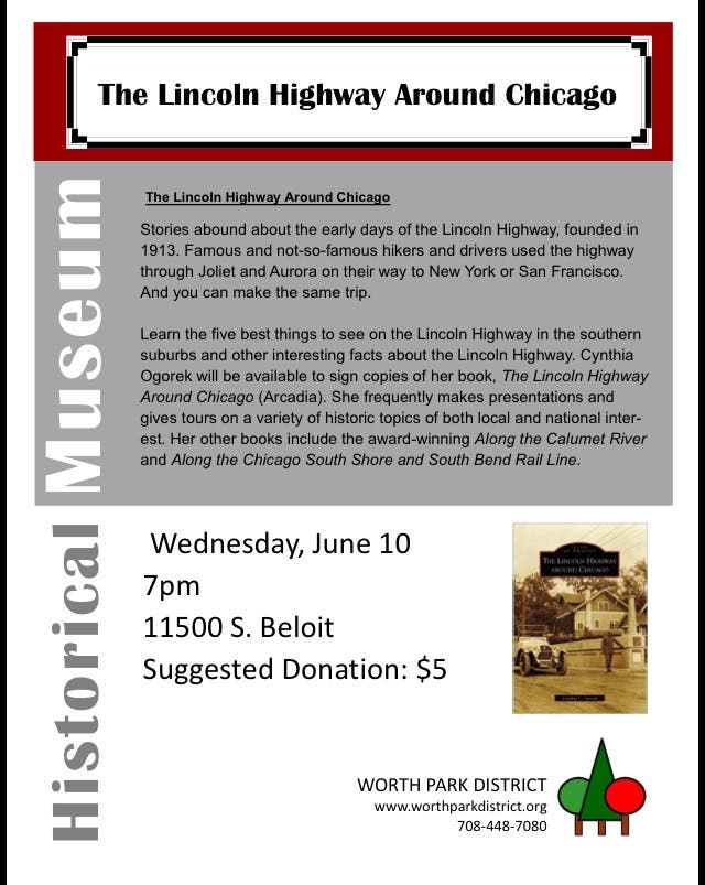 Come to the Worth Park District Historical Museum Wednesday, June 10 7pm to hear about the Lincoln Highway.