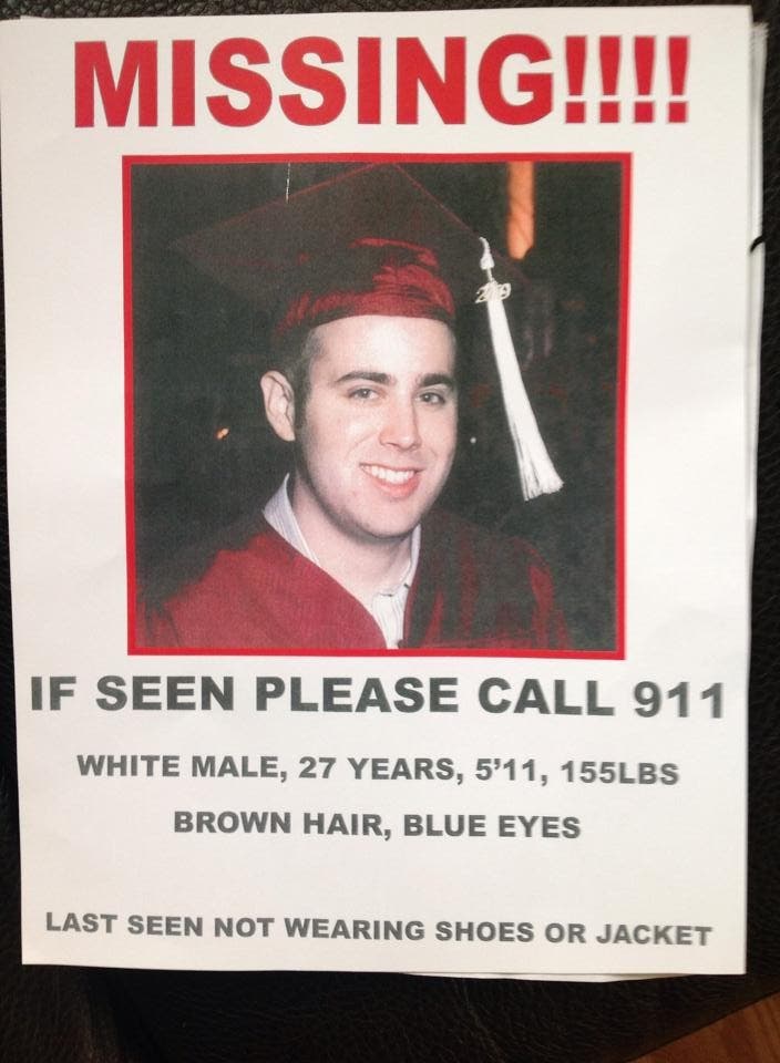 Caption: Flier for missing Chicago man, John Cunningham Jr. Cunningham told his mother he was going for a walk when he left his parents home in Palos Park on Oct. 30.