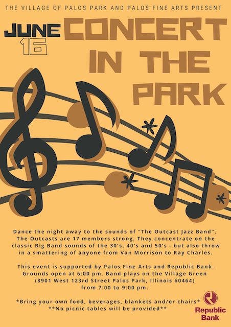 PALOS PARK, IL — The Big Band experience is alive and well as the Outcast Jazz Band performs classic tunes that your parents and grandparents danced to Thursday, June 16. The grounds open at 6 p.m. with the band playing from 7 to 9 p.m. on the village green, 8901 W. 123rd Street, Palos Park. The concert is FREE.