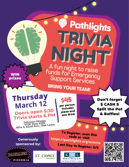 PALOS HEIGTS, IL — Put your random knowledge to work at Pathlights’ Trivia Night fundraiser coming up Thursday, March 12. There’s still time to gather your team and join Pathlights for a fun night out.
