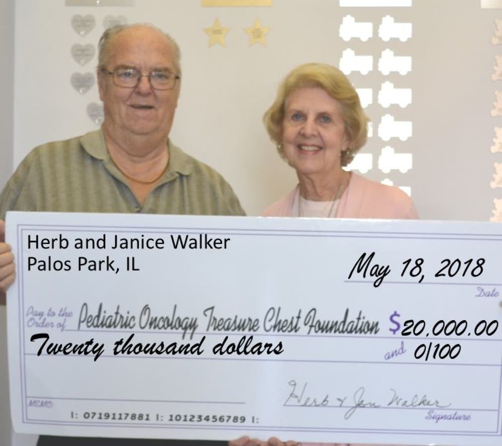 The Pediatric Oncology Treasure Chest Foundation (POTCF) of Orland Park was overjoyed recently to receive an enormous donation of $20,000 from Palos Park couple Herb and Janice Walker. Foundation Board Member Herb and wife Janice sponsored the recent opening of our 52nd Treasure Chest Program at Cleveland Clinic Children’s and Pediatric Institute in Cleveland, OH. This program will provide our services to more than 600 brave young Cleveland area cancer patients each month.