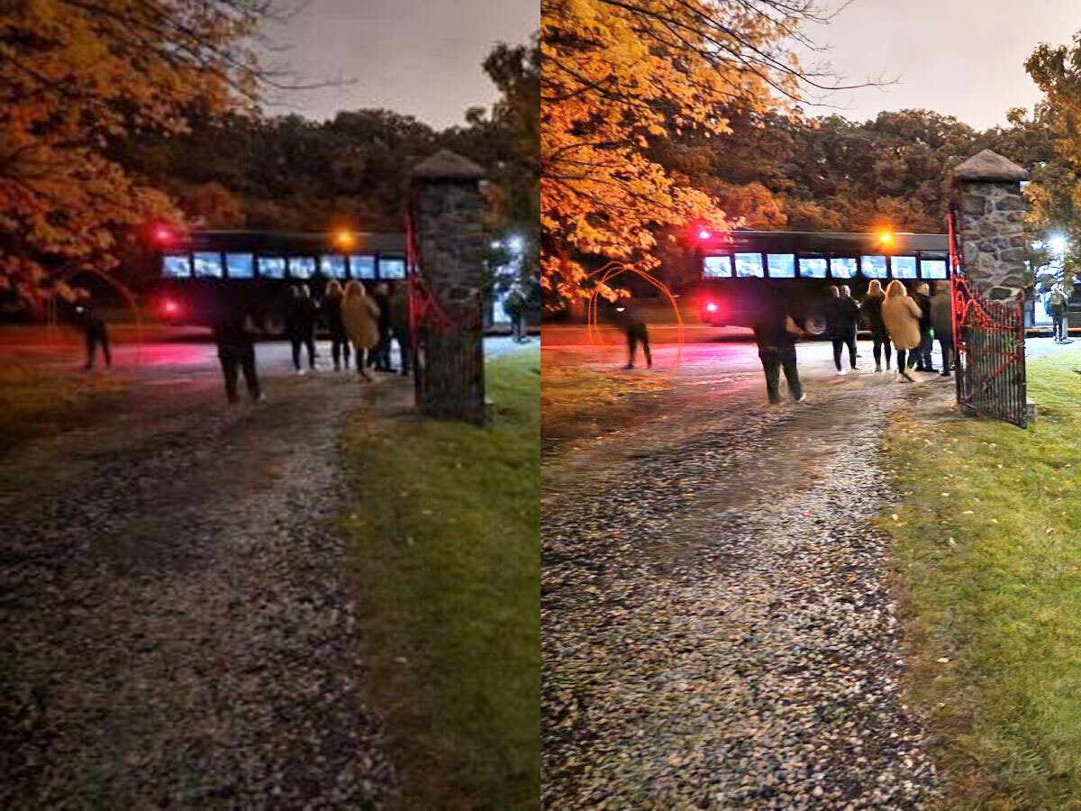 The original photo of the half-figure (left) and the second, with added brightness to bring out what Gibbons says is a translucent figure caught on the Oct. 21 Archer Avenue tour. | Courtesy of Graveside Paranormal