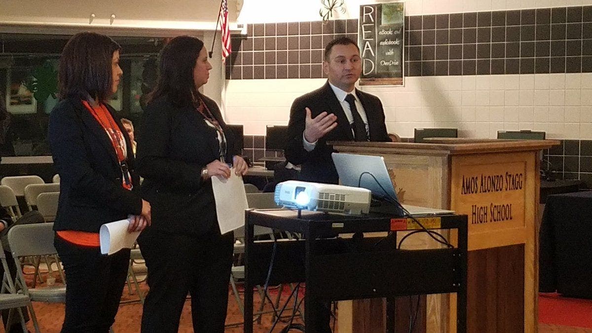 Social Worker Hillary Ortiz, Dean Kristyn Koss and Guidance Counselor Rich Kowalczyk explained that each student is assigned to a team that includes social workers, deans and guidance counselors. Even before they officially become Stagg Chargers, middle school students know what team they are on as they prepare for the transition to high school. On their first day as freshmen, they meet with their teams to begin what will become and four-year team experience. They know from the start who they can rely on for assistance.