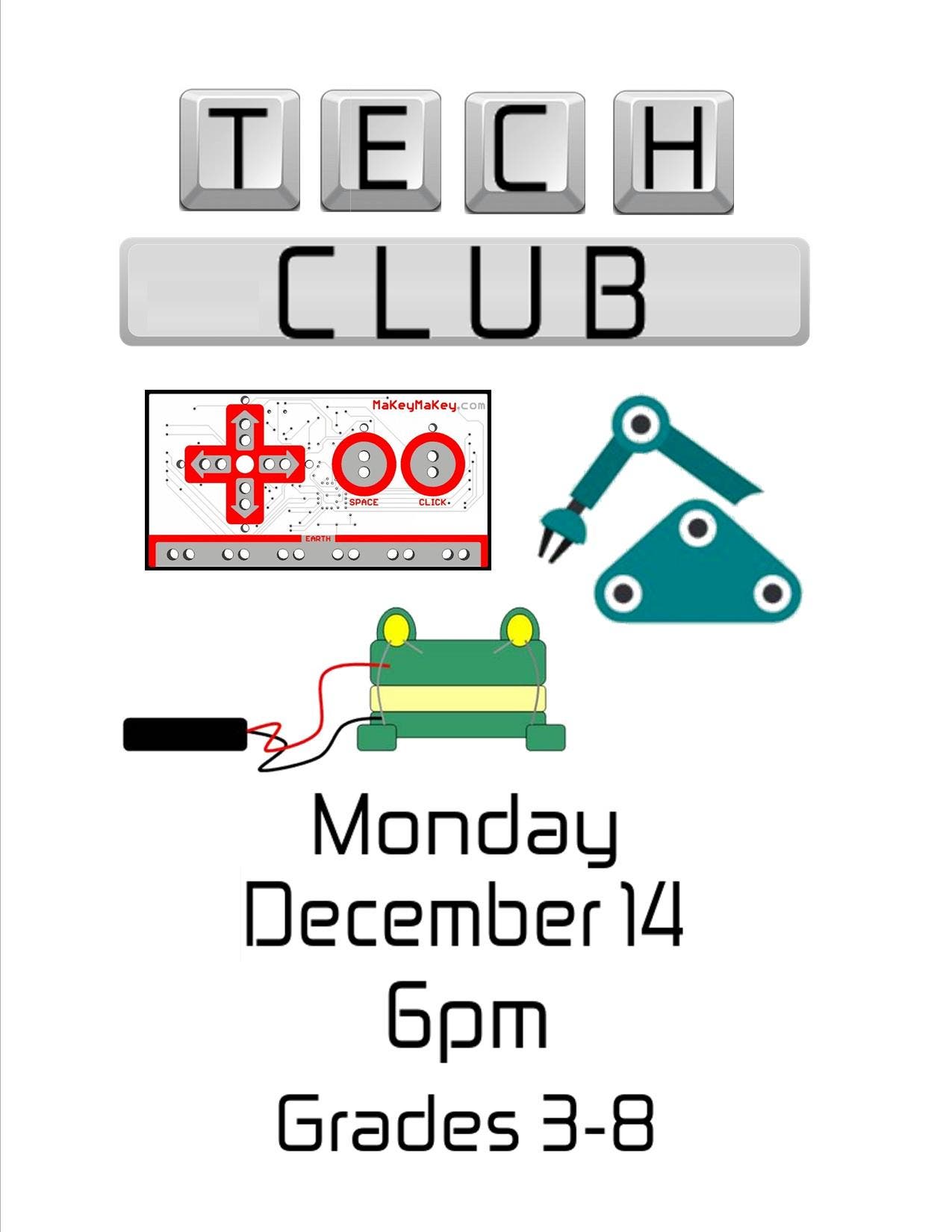 Come to the Library to explore and tinker with technology and robotics! We will experiment with Makey Makeys, Squishy Circuits, the Mbot robot, and much more! Grades 3–8. Monday, December 14 at 6pm. Registration is required and limited to 25. Register online at greenhillslibrary.org.