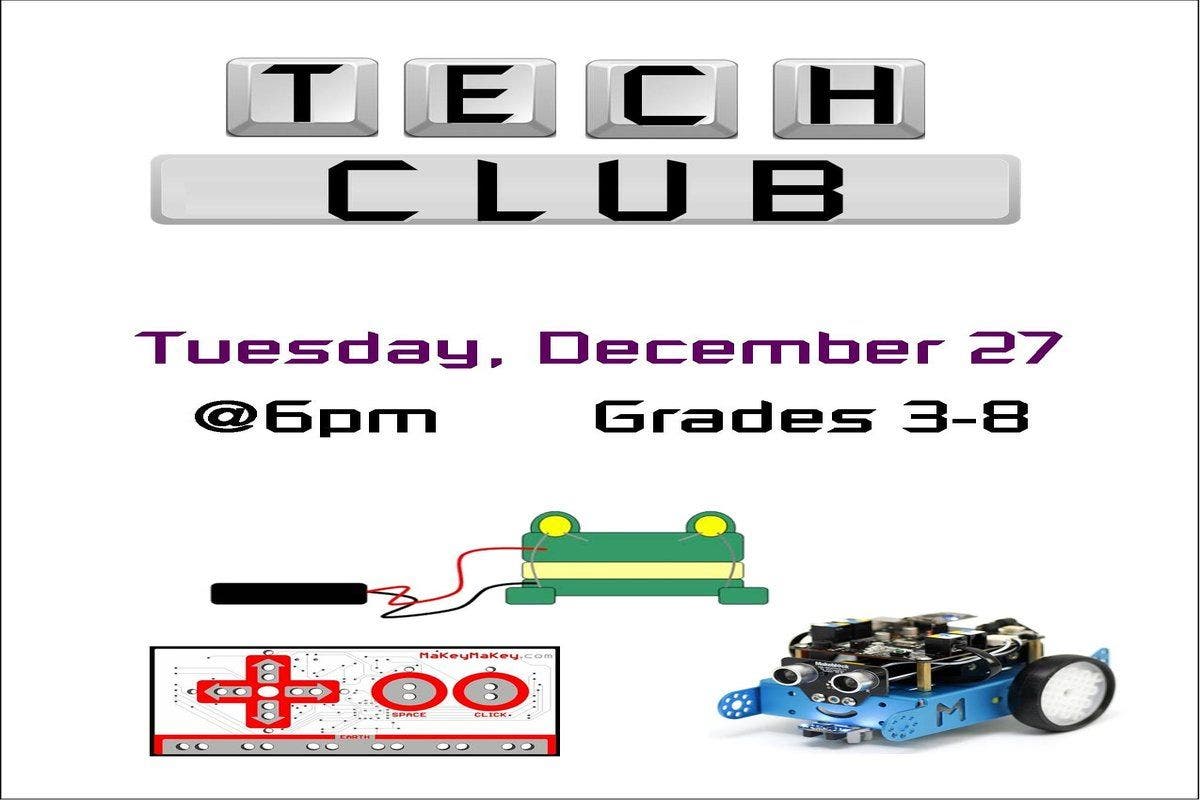 Come to the Library to explore and tinker with technology and robotics! We will experiment with Makey Makeys, Squishy Circuits, the Mbot robot, and much more! Registration is limited to 25. Grades 3–8. Tuesday, December 27 at 6pm. Register online at greenhillslibrary.org.