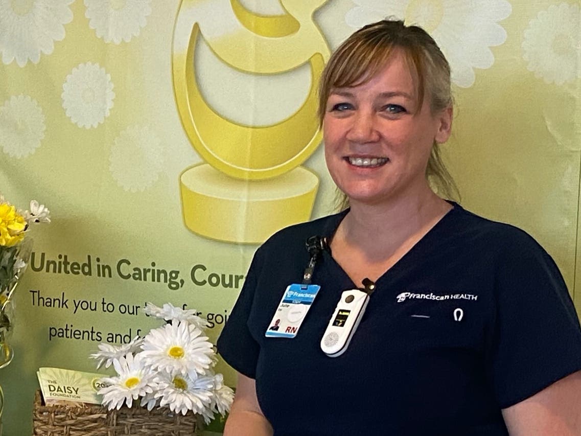 Franciscan Health recognizes the contributions of nurses all year long through the DAISY Awards. It salutes nurses like Lindley who deliver extraordinary, compassionate, and skillful care. As part of this recognition, Julie Lindley received a DAISY award pin, the Healer's Touch sculpture, a DAISY Award certificate, and a box of Cinnabon cinnamon rolls to share with coworkers. Funding for the DAISY Award is provided by the Franciscan Health Foundation.