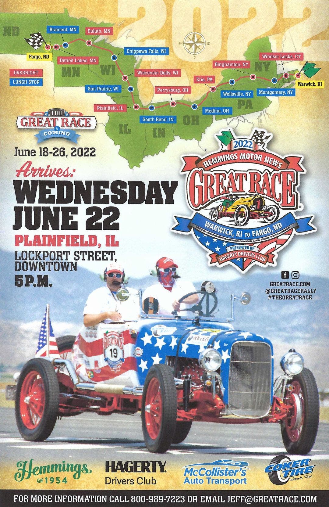 PLAINFIELD, IL — Around 5 p.m. on June 22, more than 120 vintage cars will be taking a break from the cross-country Great Race to visit Plainfield — and it's the group's only Illinois stop.