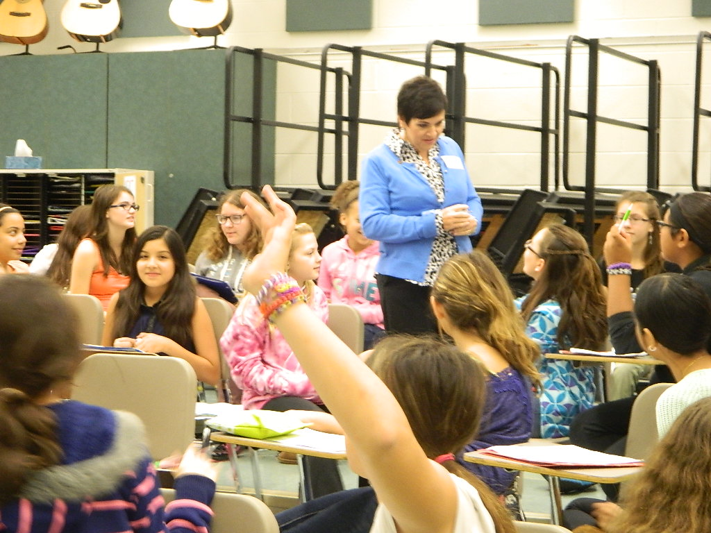 State Rep. Natalie Manley (D-Joliet) visited several classrooms at Timber Ridge Middle School on Halloween to chat with students. She asked students about their concerns and what new laws they'd like to see enacted. One student suggested a special day when parents could say only "Yes" to their kids.