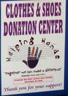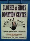 The Helping Hands boxes have white lettering that reads "Clothes & Shoes Donation Center" with a blue and white checkerboard border.