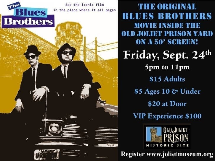 Jake & Elwood are back on the giant 50' movie screen inside of the Old Joliet Prison Yard Friday, Sept. 24th!