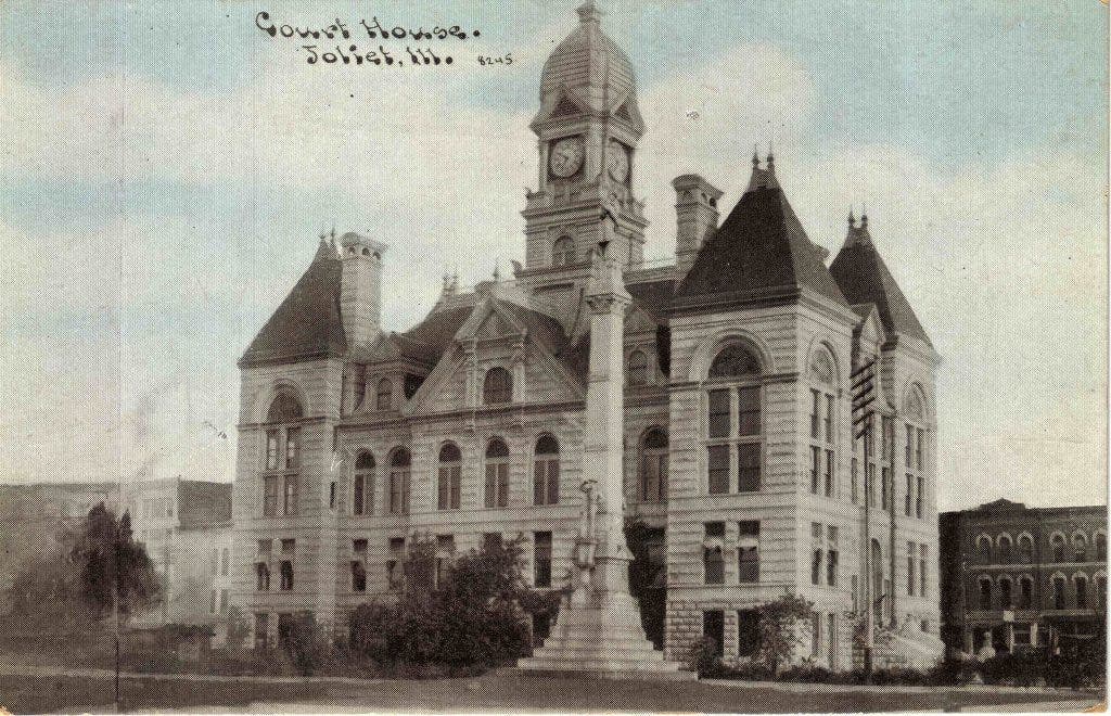 This postcard photograph shows the third Will County Courthouse from the corner of Jefferson and Chicago Streets looking southwest.