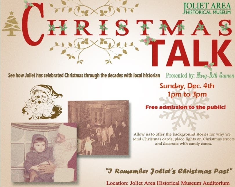 On Sunday, December 4th from 1pm to 3pm, the Joliet Area Historical Museum and local historian Mary Beth Gannon are happy to present "Christmas Talks - I Remember Christmas Past".