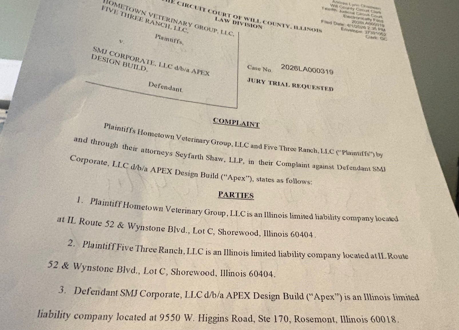SHOREWOOD, IL — Just four months after opening the new building for his Rusty Ridge Animal Center in Shorewood along Route 52 near the Village Town Center, Dr. Joe Chow has retained a Chicago law firm to file a civil lawsuit against Apex Design Build on West Higgins Road in Rosemont.