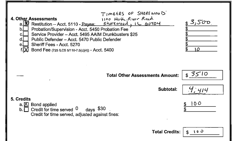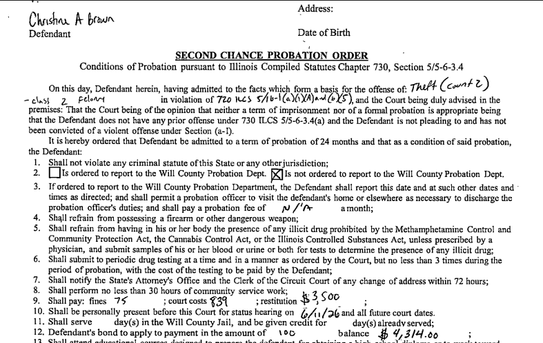 On Wednesday, Joliet resident Christine Brown, the former business manager at the Timbers of Shorewood along River Road, was sentenced by Will County Judge Amy Christiansen to second chance probation. Brown's sentencing order puts her on 24 months of court probation for her felony crime of theft. Brown was ordered pay court costs of $839 and restitution of $3,500 — Joliet Patch previously reported that Brown stole more than $100,000 in funds from Timbers of Shorewood.
