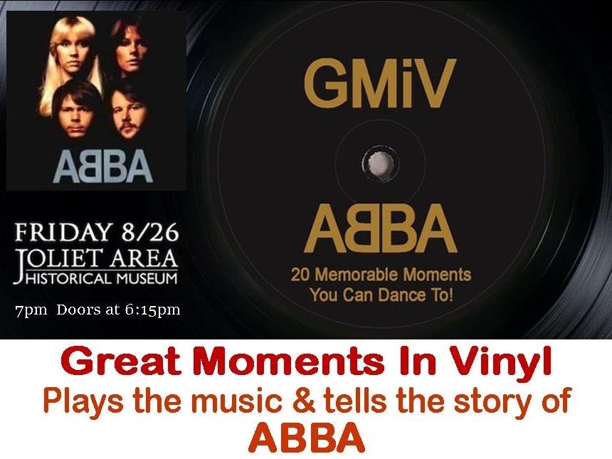 Friday, Aug. 26th at 7pm, the Joliet Area Historical Museum's "Rooftop Summer Concert Series" presents Great Moments In Vinyl playing tribute to ABBA!