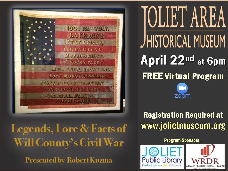 Join the Joliet Area Historical Museum's Free Virtual History Series as we present Legends, Lore & Facts of Will County's Civil War on Thursday, April 22nd at 6pm.