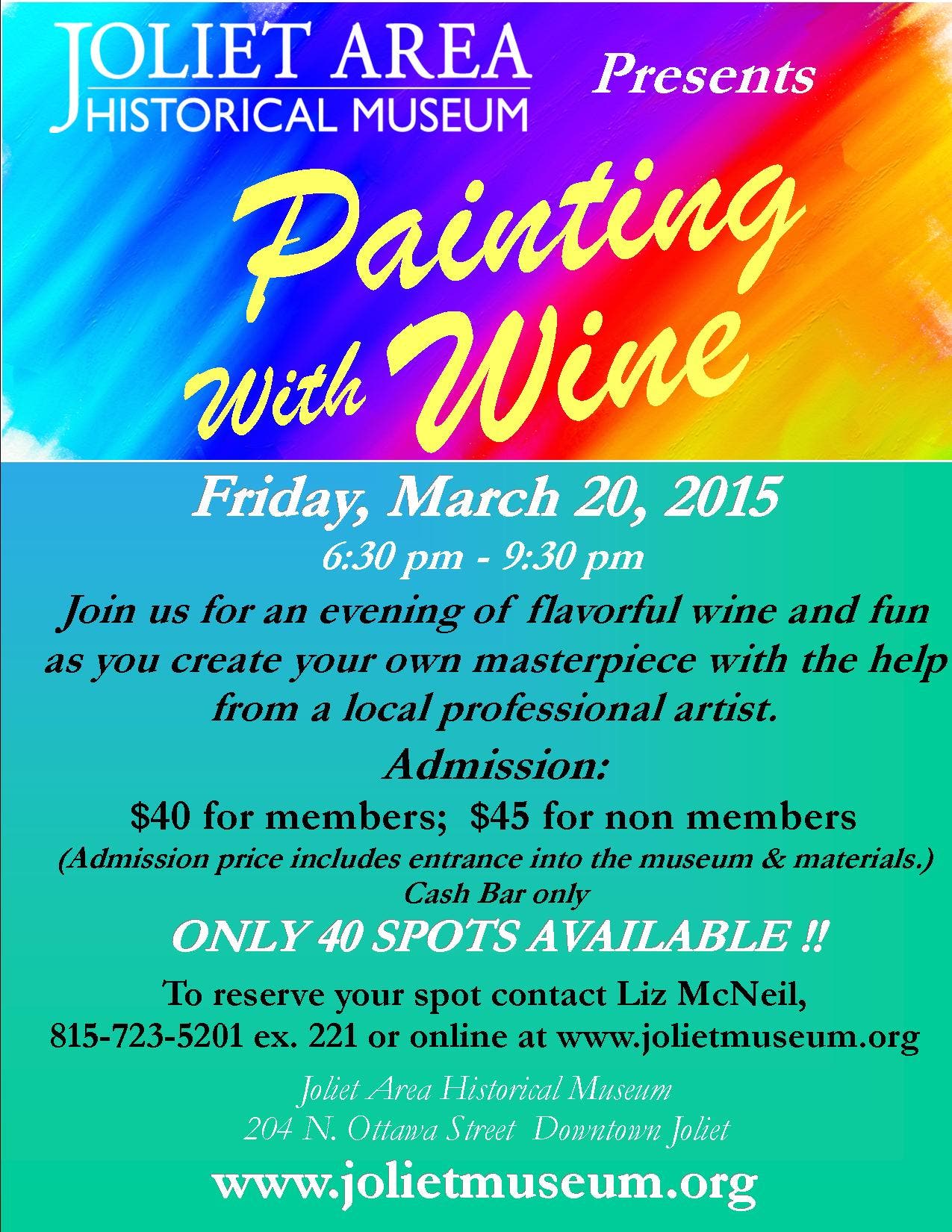 Join us at the Joliet Area Historical Museum for a an evening of flavorful wine and fun as you create your own masterpiece with the help of a local professional artist. We have a few spots left! Call today to reserve your space or go to our website to register on-line.