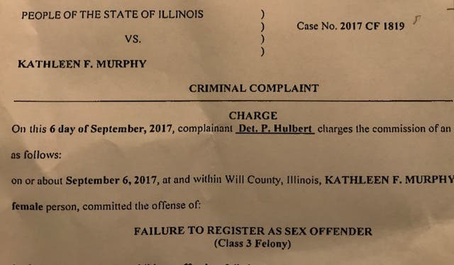 SHOREWOOD, IL - A Shorewood woman who is classified on the state of Illinois offender registry as a sexual predator has been charged with failure to register as a sex offender, a Class 3 felony. The Shorewood Police Department filed a criminal complaint against Kathleen F. Murphy on Thursday. Detective Paul Hulbert stated in court documents that Murphy failed to comply with the Sex Offender Registration Act as the law applied to her on or about September 6.