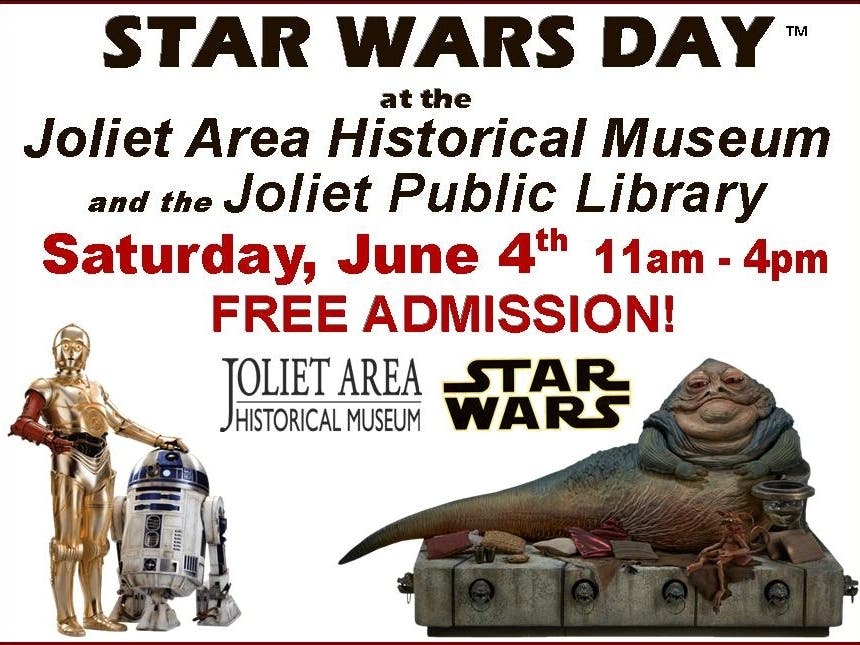 The Joliet Area Historical Museum is working in conjunction with the Joliet Public Library to bring this very popular family-friendly event to downtown Joliet. The Museum will be host to; Jabba The Hutt's Palace, Droid Builders, Action Figure Scavenger Hunt, Dr. Natalie Coleman's Steam Activities, The Wookie Den, Beverage Bar & more!