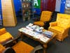 Inside, colorful red and yellow walls surround the store's interior. A coffee table stacked with children themed comic books and four rocking chairs sits in the center. Comics are organized in white cardboard boxes and a plethora of toys are being prepped for display. For a "soft open," the store seems inviting.