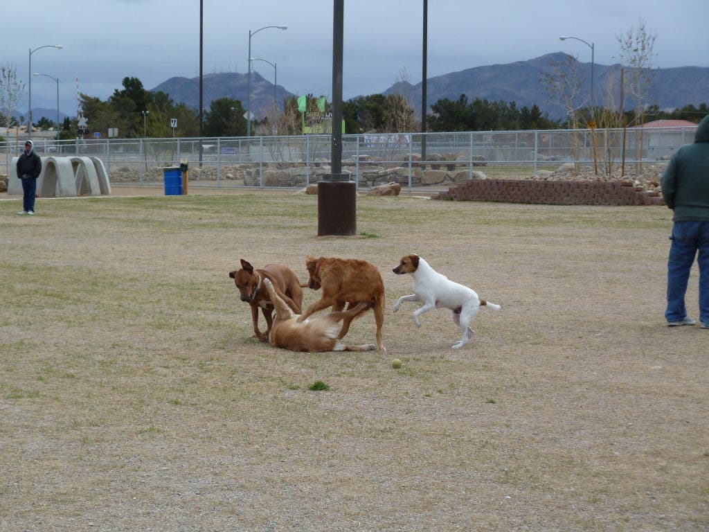 *) Behaviors to look for are: dogs frequently up on their hind legs; grabbing, dragging or shaking another dog, especially by the throat, scruff of the neck, ears, lips, feet or legs; one dog gets ganged up on by the group; one dog/your dog is always on the bottom.
