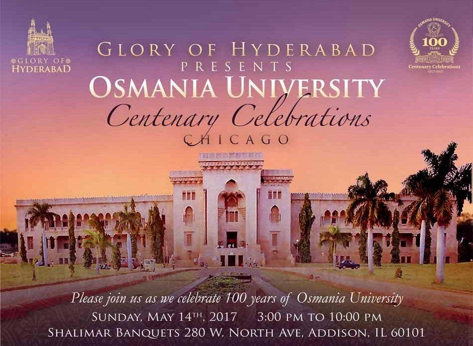 "Glory of Hyderabad", is organizing “Centenary Celebration of Osmania University”, Hyderabad, India on May 14th, 2017- Sunday, 03:00 pm to 10:00 pm, at Shalimar Banquets, 280 W. North Ave, Addison, IL 60101. Prof S. Ramachandram, Vice Chancellor, Osmania University will be the Chief Guest. Her Excellency Ms. Neeta Bhushan, Consul General of India, Chicago will preside. Mr. Hardik Bhatt, CIO, office of the Governor, IL will be Guest of Honor.