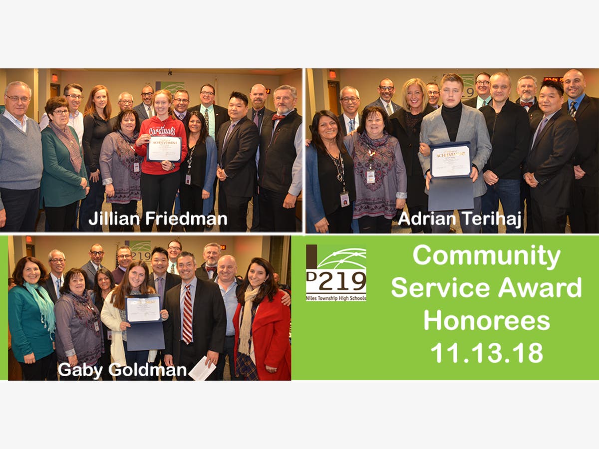 The Niles Township High School District 219 Board of Education honored three students at its November 13 meeting for their achievements in community service: Niles North senior Jillian Friedman; Adrian Terihaj, who splits time between Niles Central and Niles West; and Niles West senior Gaby Goldman.