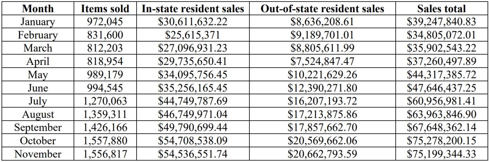 Overall, pre-tax sales declined by more than $78,800 last month, even as out-of-state pot purchasers bought $93,000 more worth of adult-use cannabis products than they did in October.