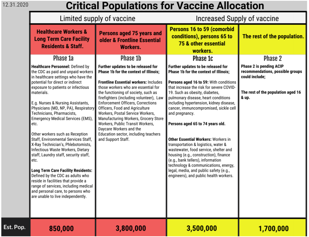 According to the Illinois Department of Public Heath, 83 percent of the state's population above age 16 falls into Phases 1a, 1b and 1c. Phase 2 includes everyone else, an estimated 1.7 million people.