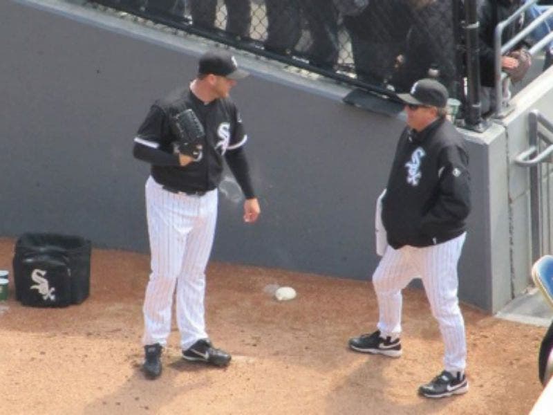 Photo by Tim Moran / Mark Buehrle talks with White Sox Pitching Coach Don Cooper while warming up before a game against the Angels in 2011.