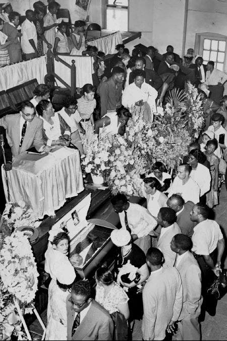 Defying orders from a Mississippi funeral home to keep her son’s casket sealed, Mamie Till-Mobley decided to hold an open-casket funeral “for the world to see what they did to my boy.” Thousands filed past Till’s open casket at Roberts Temple Church of God in Christ in Chicago’s historically Black Bronzeville neighborhood. Photos of the teen’s mutilated corpse published in Jet magazine would spark the Civil Rights movement.