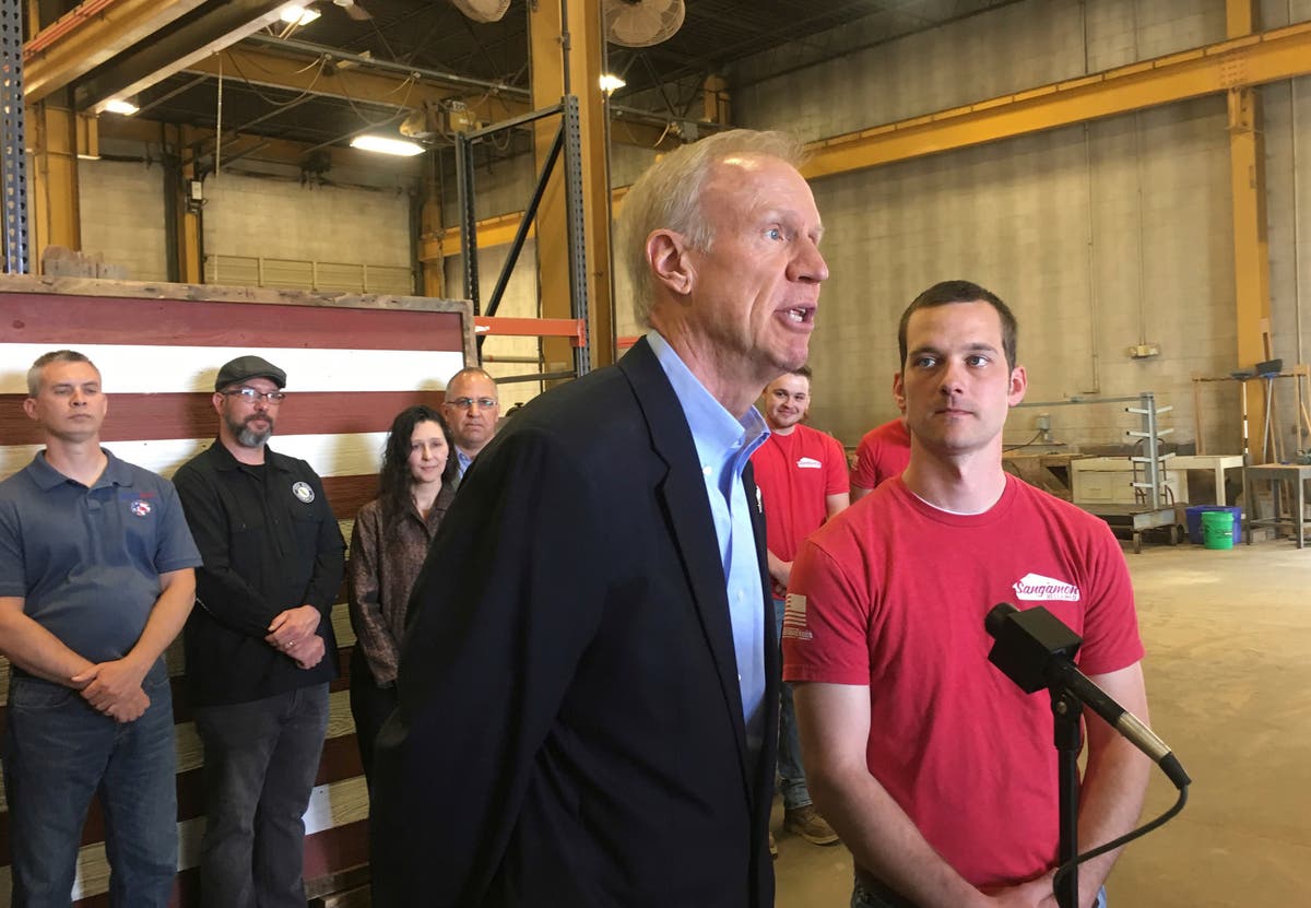 Photo: Gov. Bruce Rauner, center, speaks to reporters Tuesday, May 1, 2018, in Springfield, Ill. Rauner spoke about a report his administration is set for release Tuesday afternoon on reconstruction at the Quincy veterans home because of lingering Legionnaires' disease that has claimed the lives of 13 residents since 2015. To Rauner's right is Brian Frieze, founder of Sangamon Reclaimed, a Springfield business Rauner visited to celebrate National Small Business Week in Illinois. (AP Photo/John O'Connor)