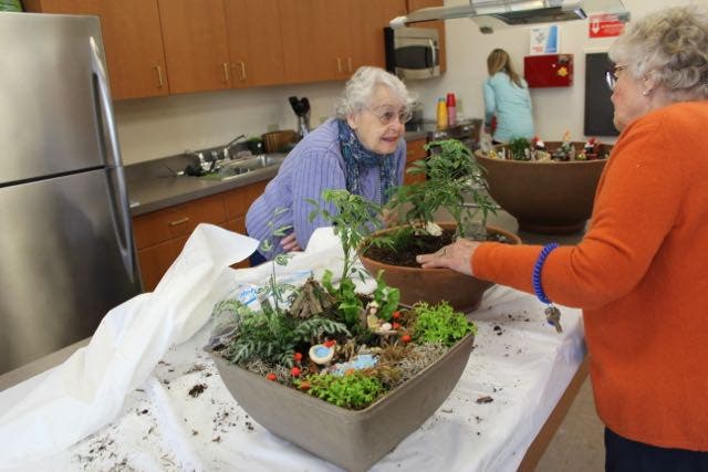 Troop members explored campus looking for nine whimsical fairy gardens that were created by resident artists and woodworkers and placed throughout the community. The gardens each held clues needed to complete the scavenger hunt. After looking for Frieda Fairy’s address, tiny critters and swings, and spotted mushrooms, the girls joined residents in the Creative Arts Center for ice cream and a fun visit.