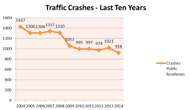 The city saw an overall decrease in crashes in 2014. There were 918 auto crashes in 2014--the lowest number in ten years--compared to 1,021 in 2013, according to St. Charles Police Department data provided to St. Charles Patch. The city also saw an overall decrease in injury crashes in 2014.