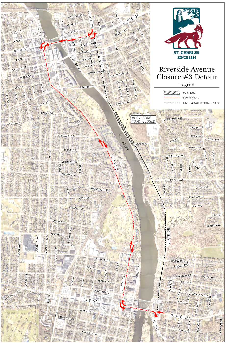 The project will take place at Route 25 and Deveraux Way. Traffic will be routed to Route 31 through posted detours at Main Street/Route 64 to the north and State Street/Route 38 to the south, according to a news release from the city of St. Charles.