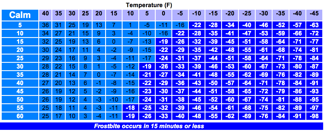 The National Weather Service predicts wind chills will drop to -20 degrees by 10 p.m., and will descend to -22 to -28 degrees overnight. Frostbite and hypothermia can occur within minutes with these kind of wind chill values, the weather service said.