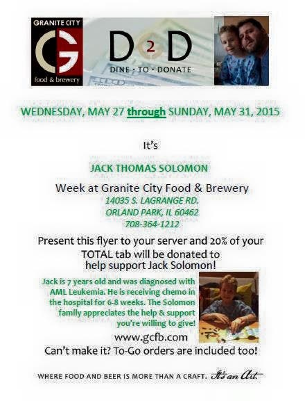From Wednesday, May 27, to Sunday, May 31, Granite City Food & Brewery, 14035 S. La Grange Road, will participate in Jack Solomon Dine 2 Donate. During that time, the restaurant will donate 20 percent of the sales of dine-in and to-go orders to a fund set up for Jack. Customers can print out and bring the flier or mention the fundraiser to their server for the donation to be made.