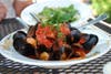 Having finished the mussels clean (this starter is big enough for two to share, or good for a meal in itself), we dutifully wiped our saucy lips clean of garlic and tomato—lunch was coming!