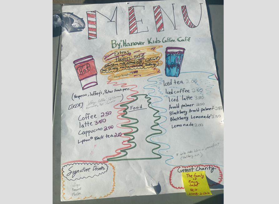 The café is all the kids' brainchild, with handwritten and drawn menus, acquired coffee-making skills, signs for advertising, and even a commercial.