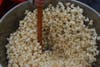 The corn is popped in a stainless steel kettle, along with some oil. After the sugar is added, Mike starts a constant vigorous stir, until the popping stops. The sweetened corn is then dumped and immediately transferred to a shallow-walled, steel mixing table for added seasoning and bagging.