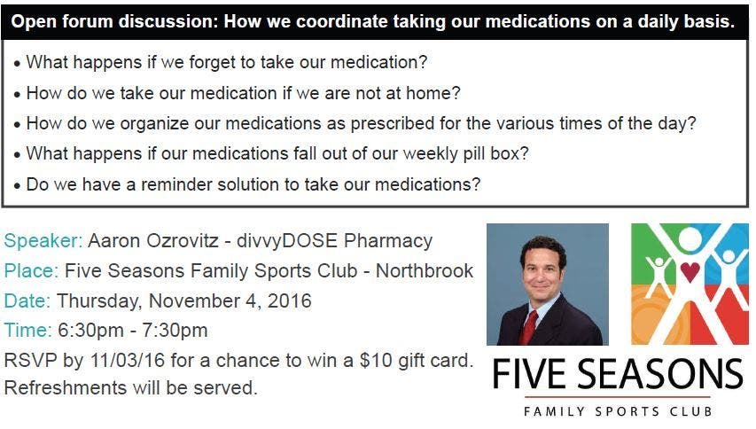 A local representative of an innovative Illinois-based pharmacy that helps people get organized to enjoy the full benefit of their medications speaks at Five Seasons Family Sports Club in Northbrook on Thursday, November 3rd.