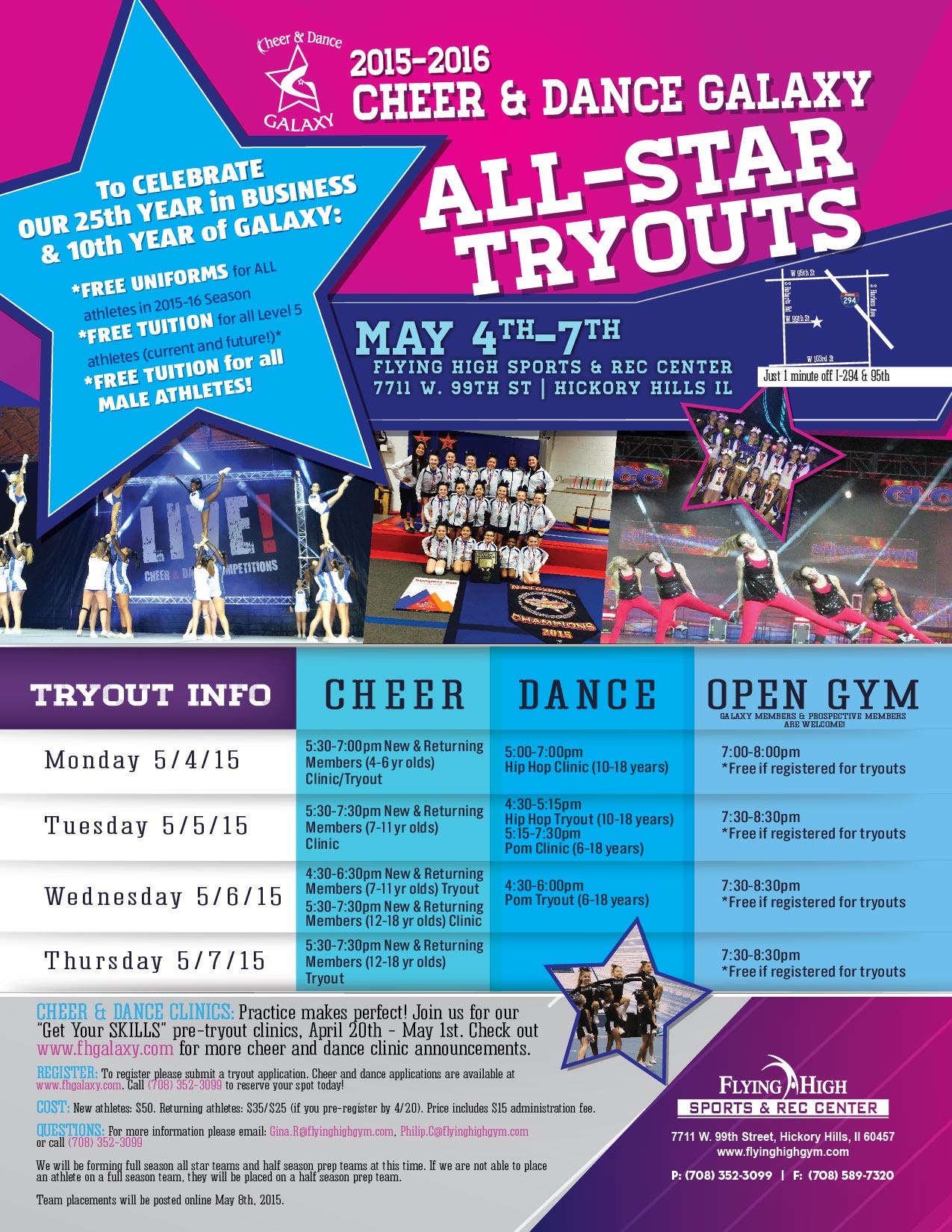 We will continue to provide a happy and healthy atmosphere for our athletes, our focus will FOREVER remain on the athleticism, and our athletes will still practice and compete in age-appropriate attire. We are excited for the 2015-2016 season and hope to see you at tryouts May 4-7th! Visit www.fhgalaxy.com for tryout application, dates, and times.
