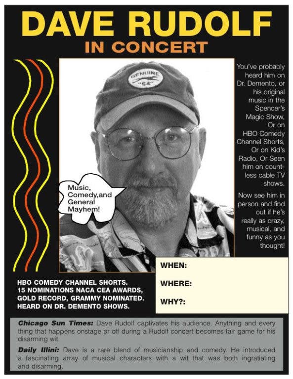 Families welcome. Join us in celebrating Library Card Sign-up Month with award winner Dave Rudolf. Brace yourself for a fun and interactive show featuring tons of laughter and participation. Kids love being on stage with Dave to show their silly sides. You’ll see a great concert and be part of it. Bring a camera! Registration (required for all children and adults) opens August 27. Limit 75.