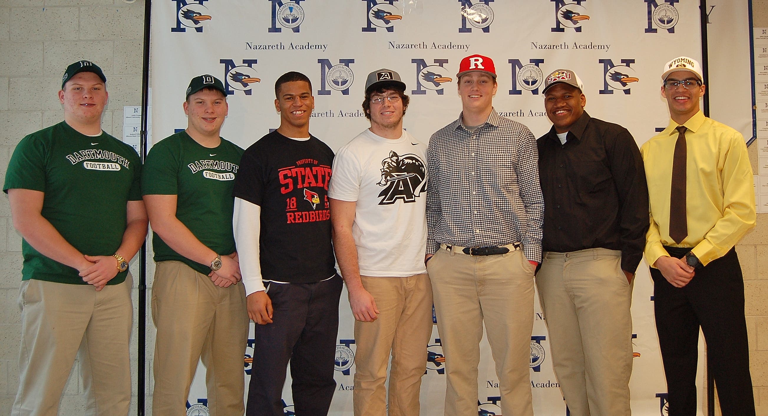 Nazareth Academy is proud to announce that multiple seniors from the undefeated 2014 IHSA Class 6A State Champion football team have officially committed to continue their academic and athletic pursuits at the college level: Kevin Jackson (Westchester) at University of Wyoming, Dmitri Joe (Westchester) at Saint Xavier University, Decxavier Kelly-Martin (Plainfield) at Illinois State University, John Kilcommons (Stickney) at Dartmouth College, Patrick Kilcommons (Stickney) at Dartmouth College, Michael Owens (Clarendon Hills) at West Point and Jack Shutack (Western Springs) at Rutgers.