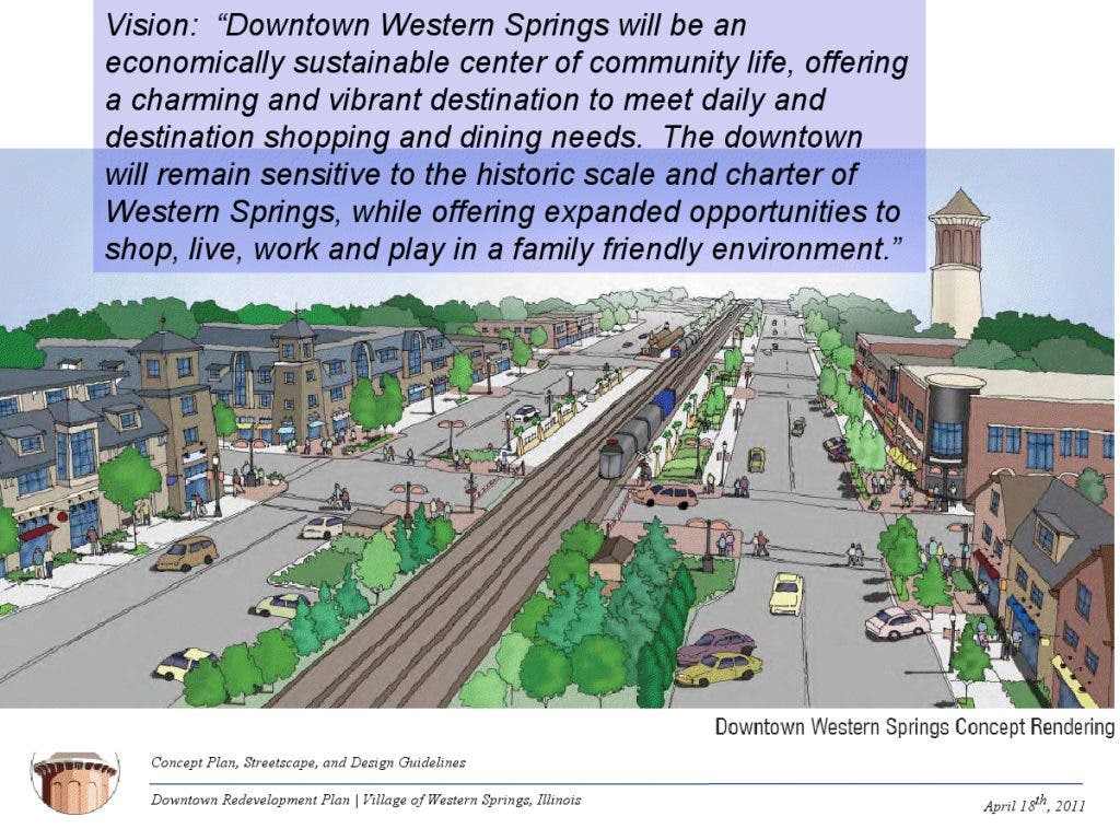 The city’s downtown vision remains the same: “Downtown Western Springs will be an economically sustainable center of community life, offering a charming and vibrant destination to meet daily for shopping and dining needs.”