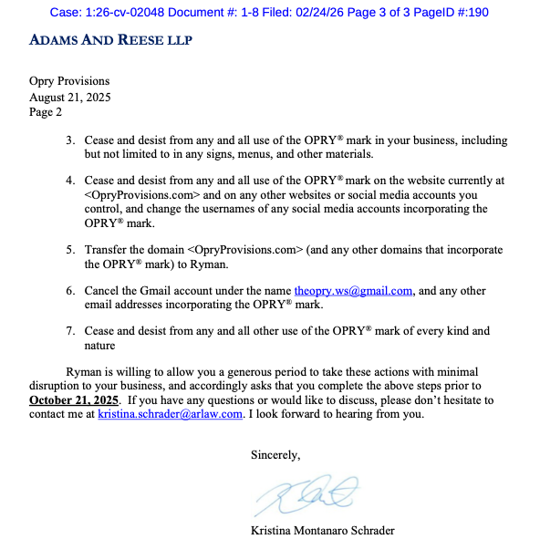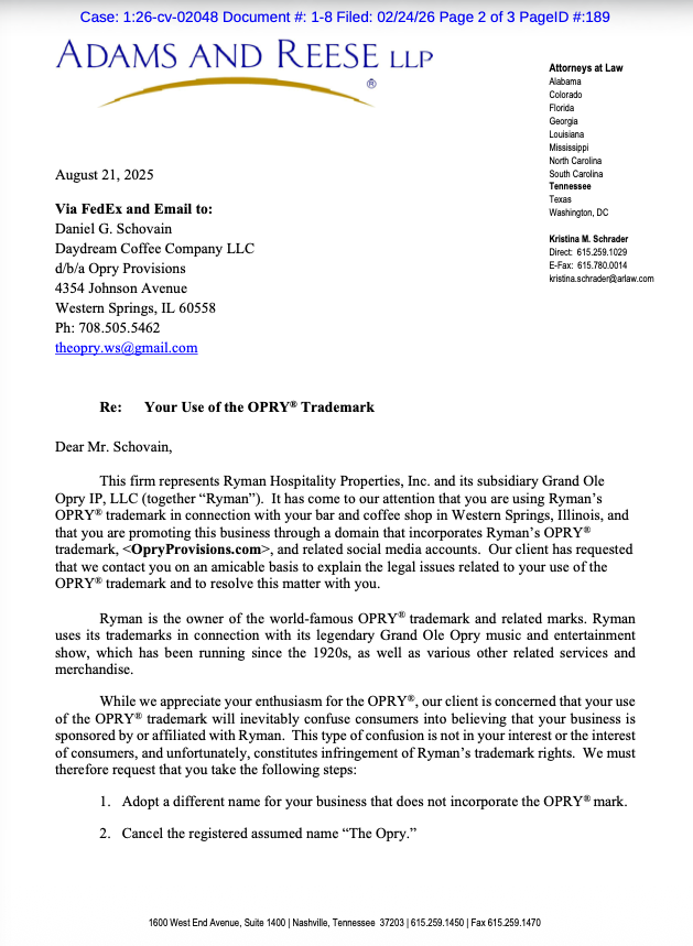 On Aug. 21, 2025, the Grand Ole Opry's law firm, Adams and Reese, sent a letter to Dan Schovain, owner of The Opry in Western Springs.