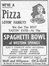 In 1958, the country’s growing demand for pizza prompted the opening of the Spaghetti Bowl in the historic Ekdahl building at 808 Hillgrove. Click on third small ad above. In 2008, the restaurant moved next door to newer quarters and the Western Springs Historical Society acquired the building, now located north of the Main Fire Station. The owners of the Spaghetti Bowl subsequently sold their business, which is now named Scavuzzo's Café Italia.
