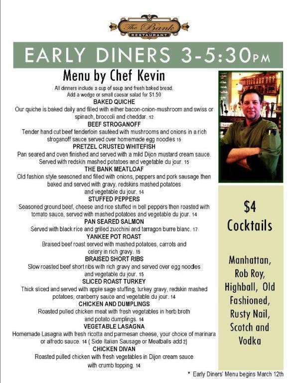 The will begin offering it's new "Early Diners" menu Monday, March 12. The menu will be available from 3-5:30 p.m., when cocktails will be $4.