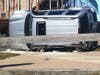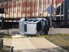 When the westbound Union Pacific freight train hit the car, the car was pushed off the tracks and onto its side, according to police.
