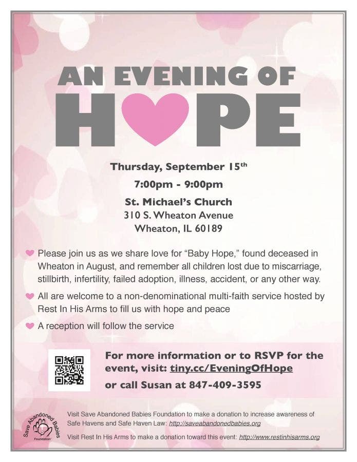 Baby Hope will be remembered during a non-denominational, multi-faith service starting at 7 p.m. on Thursday at St. Michael’s Church, 310 S. Wheaton Ave. The service will be hosted by Rest in His Arms, a Wheeling non-profit, and is meant for anyone who has been touched by the loss of Baby Hope. It is also meant for all those grieving their own experience of infant or child loss due to miscarriage, stillbirth, infertility, failed adoption, illness or accident or any other similar instances, said Susan Walker, founder of Rest in His Arms.